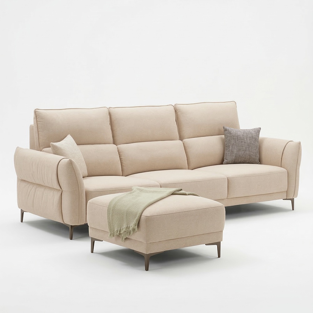 尺寸: 寬268* 深94* 高98 cm 外型:輪廓圓潤穩重,整體低調厚實,帶來十足安全感。 材質:貓抓布布料,觸感柔韌、耐磨防刮;內部以高彈力釋壓棉搭配美國 LVL 多層板,結構強健穩固。 坐感:椅墊厚實包覆,靠背高且支撐穩定,坐下時如同被穩穩擁抱,安心沉浸。
