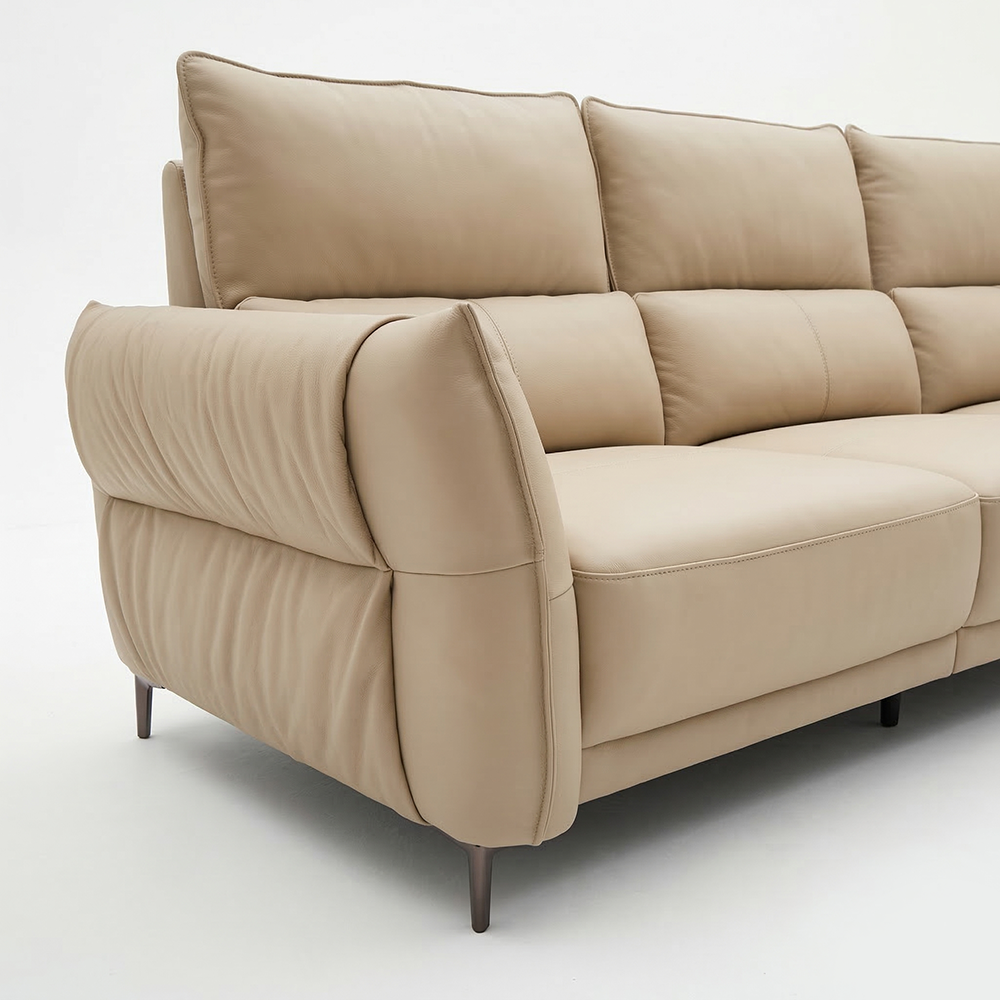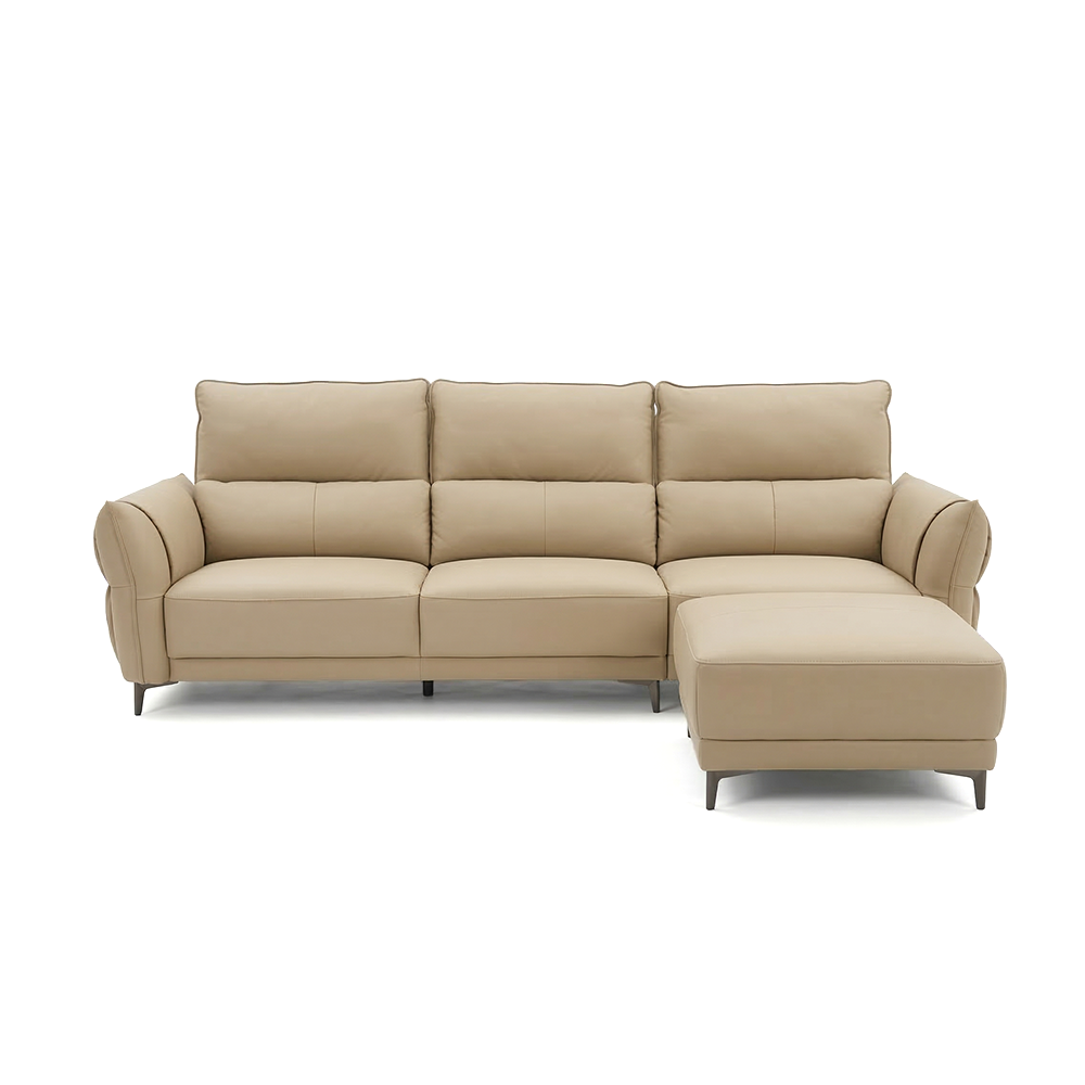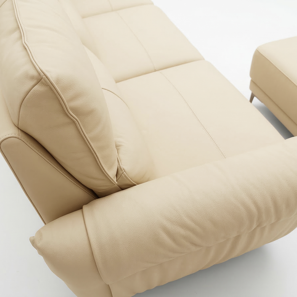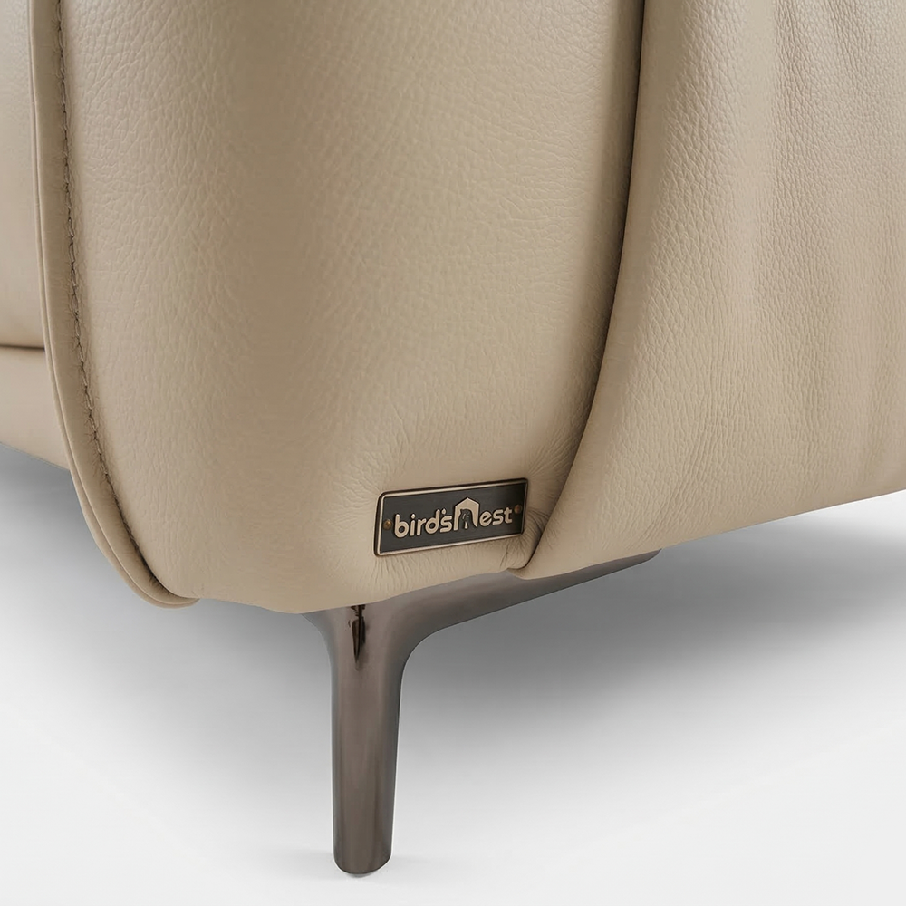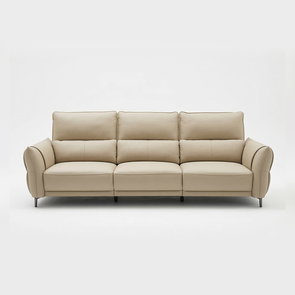尺寸: 寬268* 深94* 高98 cm 外型:輪廓圓潤穩重,整體低調厚實,帶來十足安全感。 材質:全牛皮面料,質感沉穩;內部以高彈力釋壓棉搭配美國 LVL 多層板,結構強健穩固。 坐感:椅墊厚實包覆,靠背高且支撐穩定,坐下時如同被穩穩擁抱,安心沉浸。